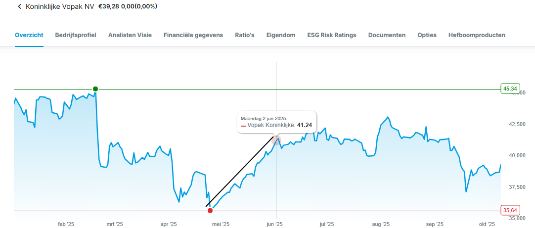 Grafiek Vopak: je ziet dat in aanloop naar de listing in India het aandeel wel degelijk opgepikt werd. Daarna kwam echter de klad er weer in, vooral eind september ging het weer bergafwaarts.