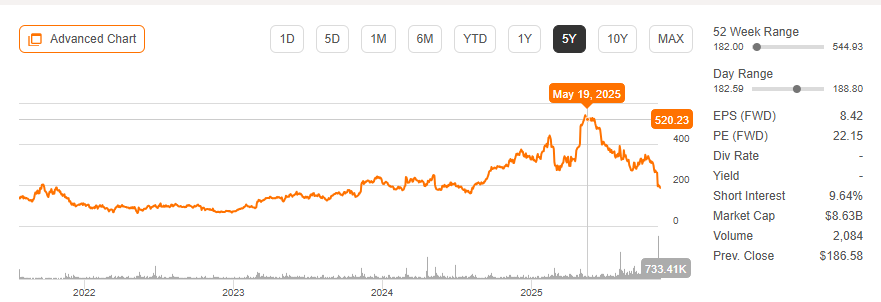 De app waar in je niet alleen talen, maar bijvoorbeeld ook wiskunde en schaken kunt leren heeft het moeilijk. Het overhypte aandeel steeg naar 540 dollar maar kreeg gisteren, na de update van het bedrijf, opnieuw een forse klap omlaag van 20% en koerst nu rond de 200 dollar.