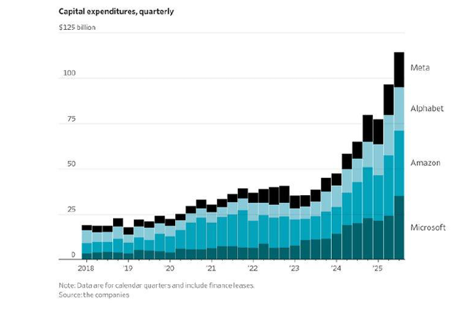 Wie gaat dat allemaal betalen? De hyperscalers moeten dat allemaal betalen. Hun capex, kapitaalinvesteringen, rijzen de pan uit. Hier zie je wat ze de afgelopen jaren per jaar uitgaven, en hoe dat nu is.