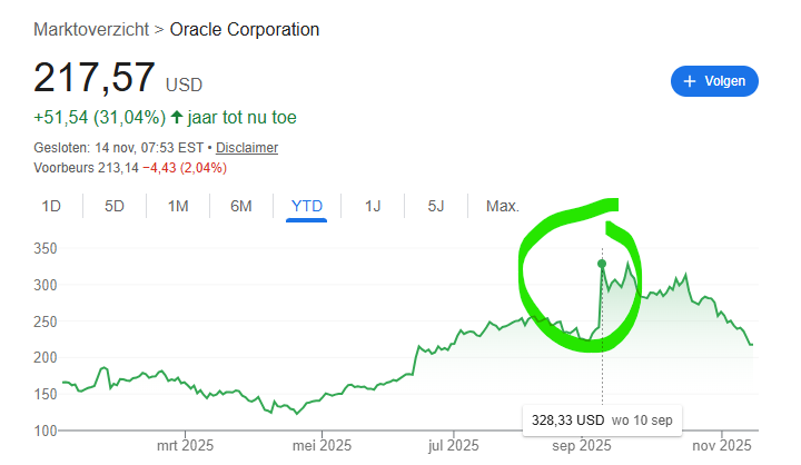 Hier zie je de koersontwikkeling van Oracle. Na de gigantische deal met OpenAI steeg het aandeel op één dag met 40%. Die winst van begin september is nu GEHEEL verdwenen.