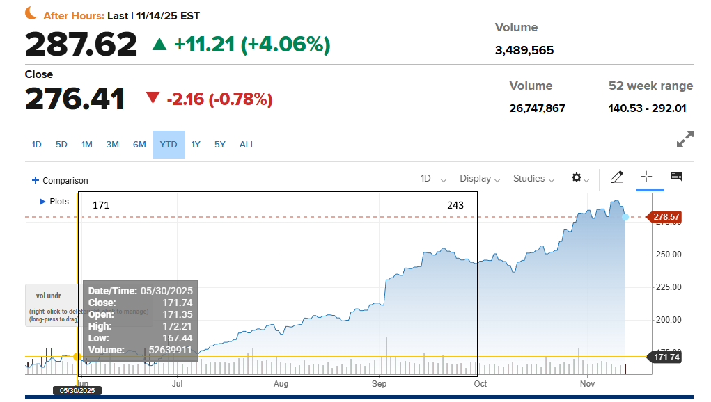 Dat Berkshire nu al op winst staat, is vrij zeker. Hier zie je de koersontwikkeling van Alphabet gedurende Q3. De 13F-filing geeft de situatie aan einde kwartaal, dus op slot 30 september.