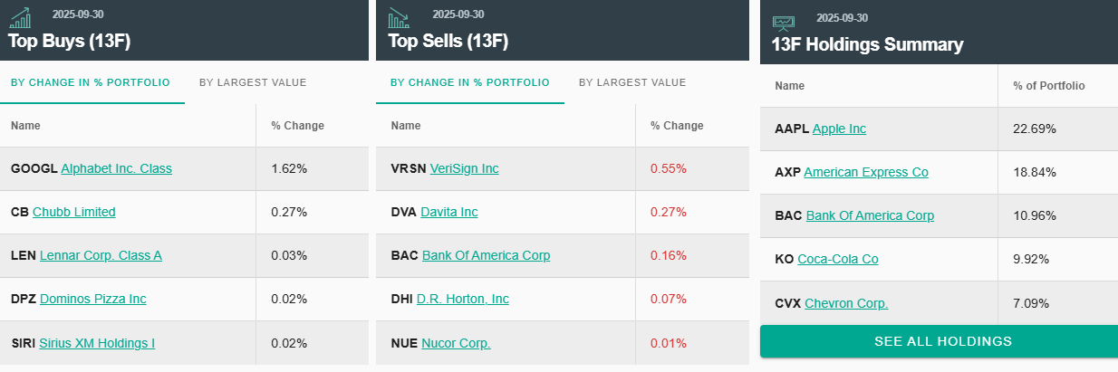 Halverwege november, zes weken na kwartaalsluiting, komen altijd weer de 13F filings uit, waarmee je kunt zien hoe de posities van grote beleggers zijn veranderd. Die van Berkshire zie je hieronder.