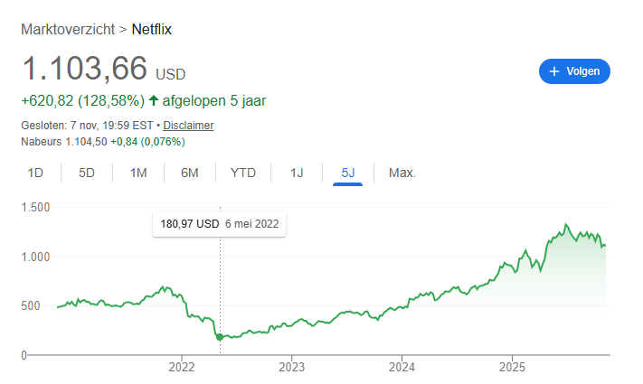 De dip bij Netflix is dus niet alleen te wijten aan het tijdelijk even teruglopen van de abonnees, de Nasdaq daalde in dezelfde periode met 31%. Van 16.000 naar 11.000…..