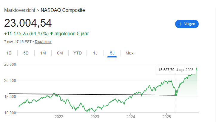 Nog even over de Nasdaq. Ik keek even wat beter naar het grafiekje over de afgelopen vijf jaar. Bijzonder is dat vanaf corona naar de low in 2022 de Nasdaq daalde van 16K naar 11K; met 31%.